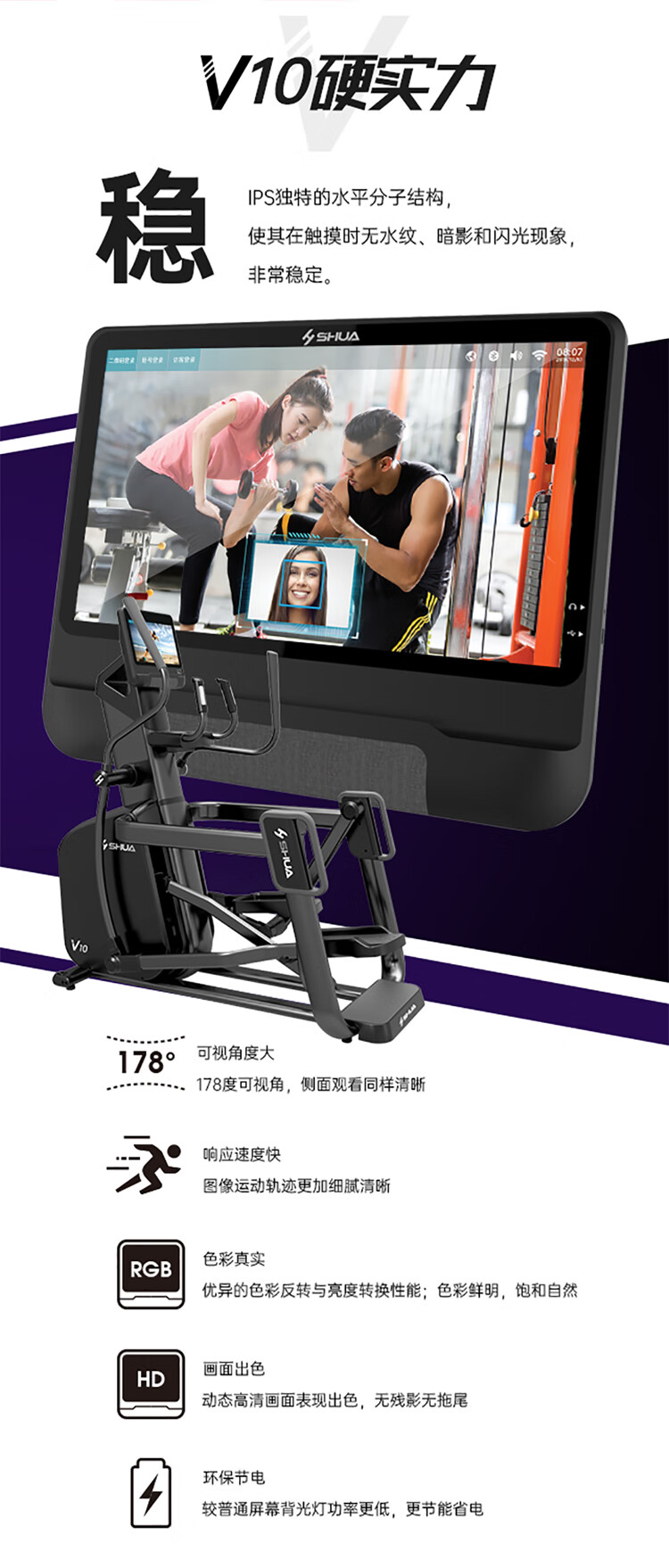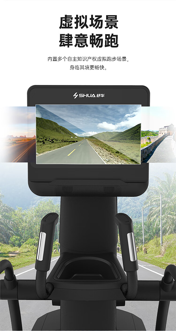 舒华高端跑步机SH-T9100T(V10+)拥有超大高清32寸10点触控晶屏的工业屏,具有扫码、刷卡、人脸识别等多种智能登录方式,方便快捷,并且有在线教学、专业健身模式随意切换,让您开启科学健身。