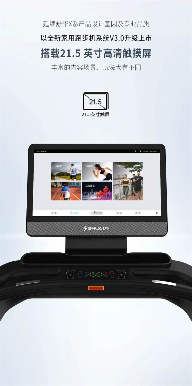 舒华X5 Pro豪华智能跑步机采用全新舒华跑步机系统,搭载21.5寸大屏,内置九种运动程序,包括场景跑、在线约跑和一键体育考试等内容,亦有教练在线科学指导和比赛互动,可在线升级,历经耐久性测试,让您使用更安全,双跑台设计,全减震系统,核心动力采用F级耐高温马达,5.0HP峰值马力,提供源源动力,让您享受每一次畅跑体验。